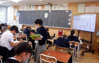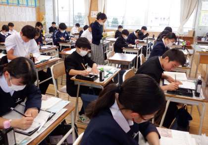 11月20日(月) 2限 1−Aの国語の授業風景です。毛筆でひらがなの練習をしています。