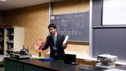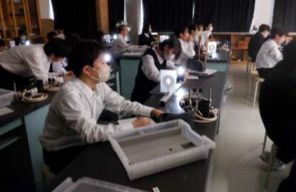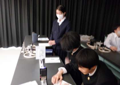 1−Bの理科の授業風景です。凸レンズでできる実像、虚像についての実験をしています。不思議な現象に生徒は興味津々です。
