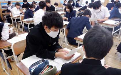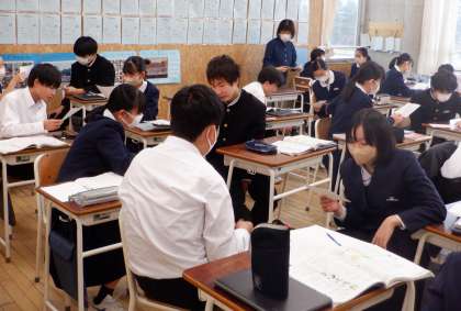 2−Bの家庭科の授業風景です。消費者トラブルから身を守る方法を考えています。まずは悪徳な訪問販売のロールプレイをして、実体験として捉えています。