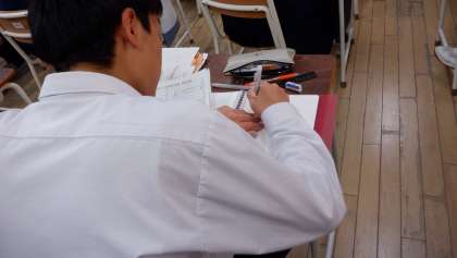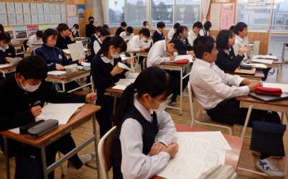2−Aの数学の授業風景です。テストの振り返りをしています。間違えた問題を、ノートに書いてもう一度チャレンジしている生徒もいました。