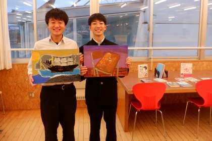 2年の学年フロアには、美術の作品を仕上げている生徒がいました。ペットボトルの中の海賊船や宇宙にたたずむ椅子など、空想の世界を個性的な作品で表現しています。ステキですね!