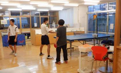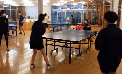 卓球部の活動の様子です。部長を中心に、みんなでアイディアを出し合って活動を進めています。