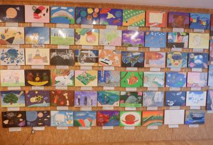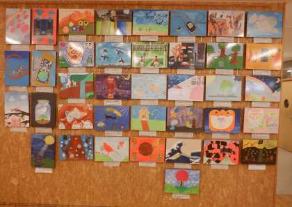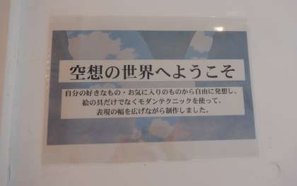 2学年のフロアには、美術の時間に制作した「空想の世界」のパネルが展示されています。