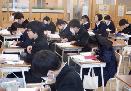 12月18日(月) 1限 3−Cの社会の授業風景です。先生の話を楽しそうに聞いています。