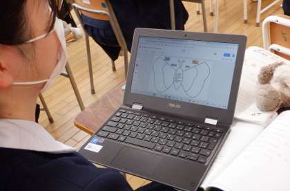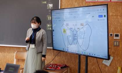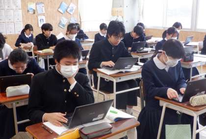 3−Dの英語の授業風景です。「中学生がスマホを学校に持ってくることはどうか」ということについて、賛成・反対の理由を英語で記入しています。端末を活用すると、分かりやすくまとめることができます。