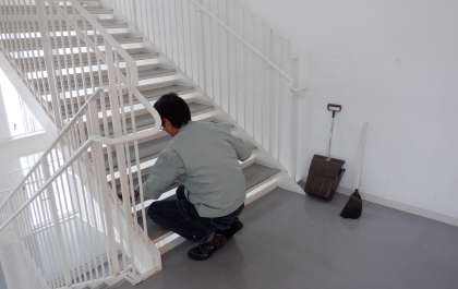 雪は降らないものの、気温が低く寒い日となりました。そんな中、用務員さんが手すりのペンキを塗ったり、階段の汚れを落としたりしれくれています。おかげで、階段はピカピカです。用務員さん、ありがとうございます!