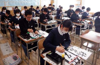 1月9日(火) 2学年の書き初め大会の様子です。2年生は「称名の滝」を行書で書きました。集中しています!