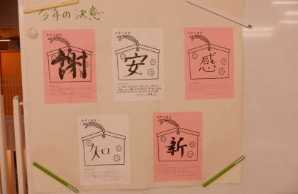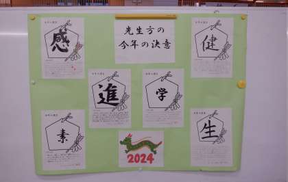 願いを込めて 公開日 2024/01/10 更新日 2024/01/10 芝園の一日 1月10日(火) 学年フロアには、担当の先生の「今年の一文字」が掲示してあります。どんな1年にしたいか、願いが込められています。