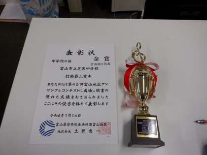 昨日(14日)、本校の吹奏楽部は「富山地区アンサンブルコンテスト」に出場しました。能登半島地震の影響で、年明けは十分な練習ができない状況の中でしたが、心を一つにして美しい合奏を目指し、すばらしい成績を収めることができました。