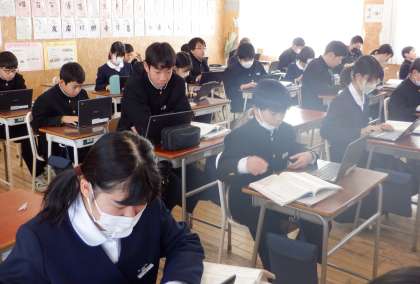1−Aの国語の授業風景です。「『不便』の価値を見つめ直す」という教材で学習しています。作者の主張について、根拠をもとに自分の考えをまとめています。