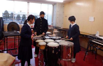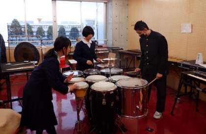 吹奏楽部です。打楽器チームは、28日のアンサンブルコンテスト富山県大会に出場します。練習にも力が入っています!