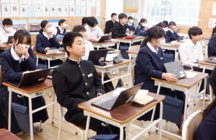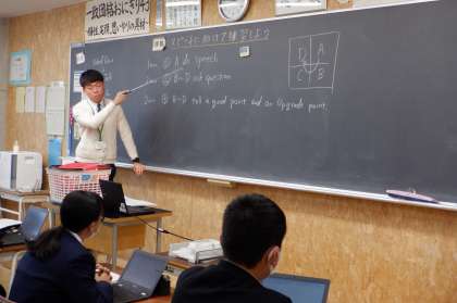 2−Bの英語の授業風景です。スピーチ用のスライドや発表原稿も仕上がり、いよいよ発表の準備です。お互いにスピーチし合って、予想される質問も考えます。