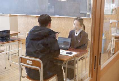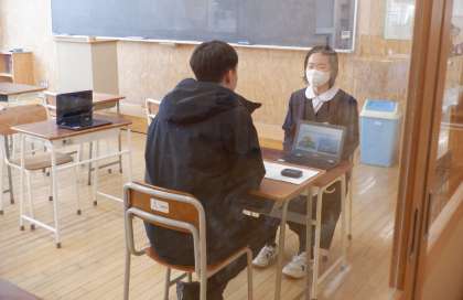 2−Cの英語の授業風景です。スライド作りも完成し、今日はいよいよスピーチテストです。ALTの先生に、英語でプレゼンしています。上手く伝わったかな?
