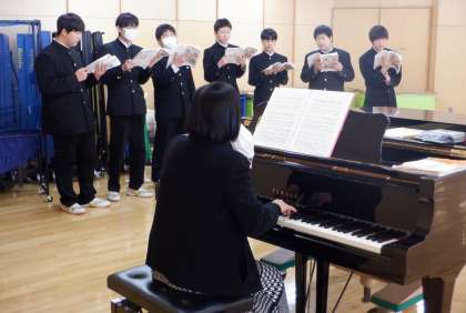 あなたへ〜旅立ちに寄せるメッセージ〜 3−A音楽 公開日 2024/01/26 更新日 2024/01/26 芝園の一日 1月26日(金) 3限 3−Aの音楽の授業風景です。卒業式で歌う「あなたへ〜旅立ちに寄せるメッセージ〜」の合唱練習をしています。心を込めて歌っている姿、ステキです!