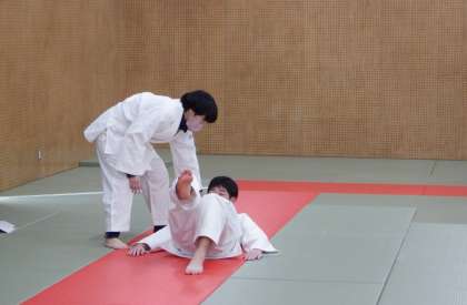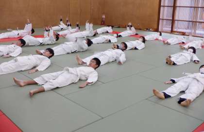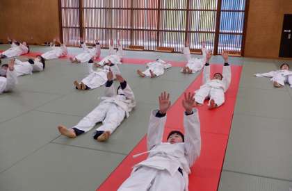 1−Aの体育の授業風景です。柔道の授業が始まりました。まずは、基本の受け身から。生徒は気合いを入れて稽古に励んでいます。