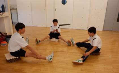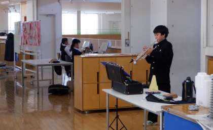 野球部は、休憩の時間も股関節を柔らかくするストレッチをして、時間を有効活用しています。吹奏楽部は、卒業式の歓送で演奏する楽曲の練習をしています。