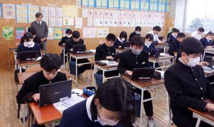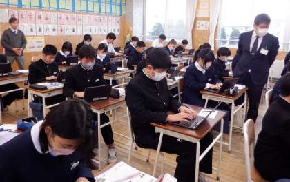 1−Aの技術の授業風景です。タイピングの練習をしています。小学校から端末をよく活用しているので、タイピングも上手です!
