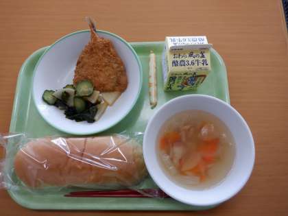 今日の給食 公開日 2024/02/09 更新日 2024/02/09 芝園の一日 2月9日(金) 今日の給食メニューは、 ・コッペパン ・牛乳 ・アジフライ ・マカロニスープ ・大根サラダ ・棒チーズ です。 アジフライはとても大きく、外はサクサク中はふっくらでした。