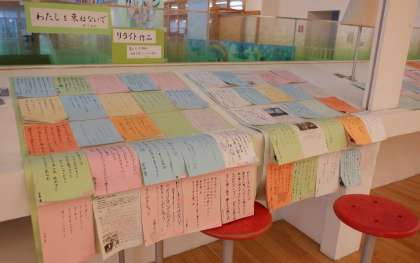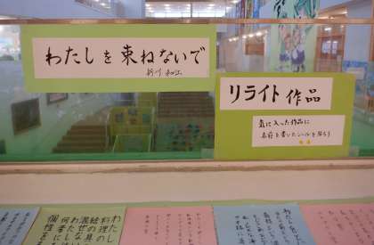 2階のワークスペースには、「わたしを束ねないで」のリライト作品が展示してあります。生徒のみずみずしい感性が光る作品が多くあります。ぜひ、ご覧ください。