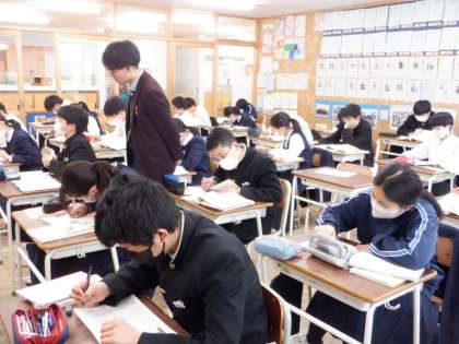 2−Bの国語の授業風景です。「走れメロスが後世に読み継がれているのはどうしてか」という課題について、自分の考えをまとめています。