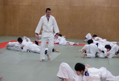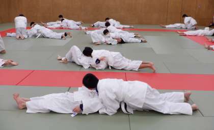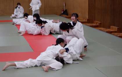 1−Cの体育の授業風景です。中学生でも安全な固め技の練習をしています。生徒は集中して活動しています。
