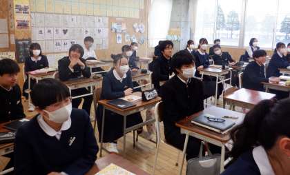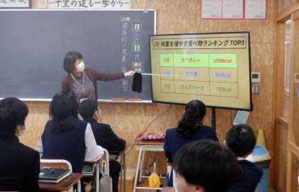 3−Dの家庭科の授業風景です。今日は、3年間の家庭科で学習したことを振り返っています。課題解決学習で作成したスライドを、みんなで楽しく見直していました。3年間で、たくさんのことを学びましたね。