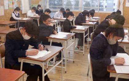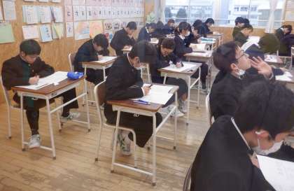 今日は学年末考査の2日目です。早朝は雪が降り寒い日となっていますが、生徒は一生懸命テストと向き合っています。