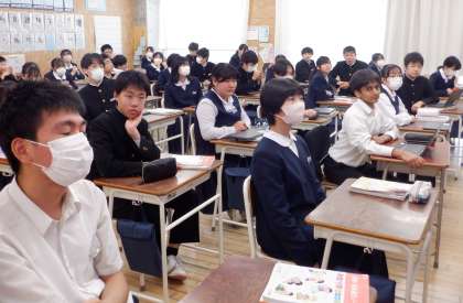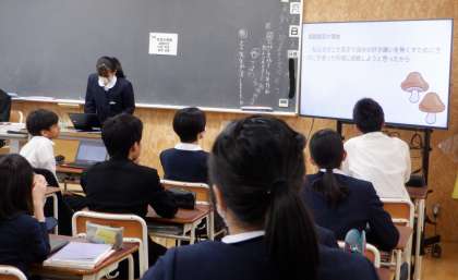 2−Cの家庭科の授業風景です。これまで追究してきた課題についての発表会をしています。「きのこを克服するには」「野菜を摂取しよう」など、自分の食生活を振り返っての課題を追究しました。