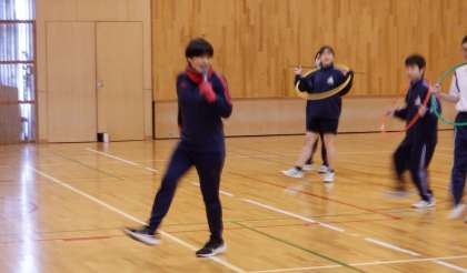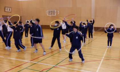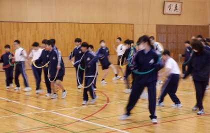 1−Bの体育の授業風景です。ダンスの授業です。「マイムマイム」の曲に合わせて、楽しく体を動かしています。みんな体育が大好き!