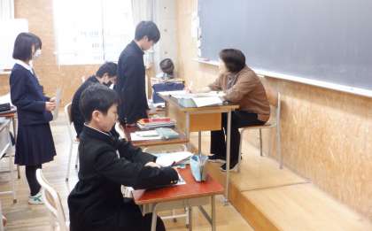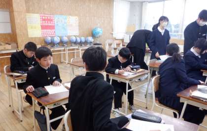 1−Aの数学の授業風景です。1年間の学習を振り返って、問題に挑戦しています。少人数での学習なので、先生や友達に質問しやすい雰囲気で理解も深まります。