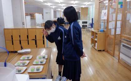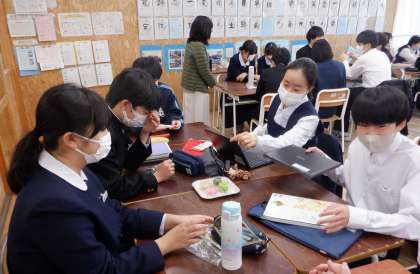 和菓子に込めた日本の心 2−B家庭科 公開日 2024/03/06 更新日 2024/03/06 芝園の一日 3月6日(水) 1限 2−Bの家庭科の授業風景です。2年生も日本の食文化の学習から、和菓子に目を向け、「和菓子に銘をつけよう」という課題で学習しました。日本の文化に触れる、よい体験です。