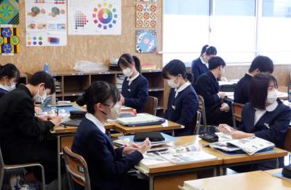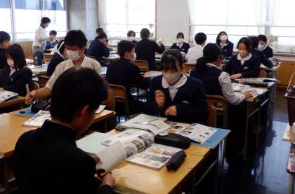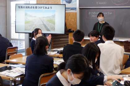 3月11日(月) 2限 2−Cの美術の授業風景です。一点透視図法と消失点について学習をしています。