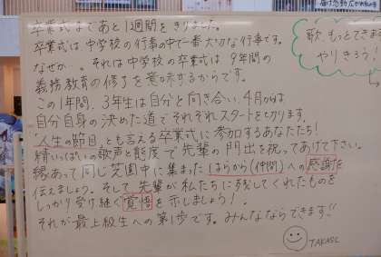 先輩から受け継ぐもの 2年生 公開日 2024/03/11 更新日 2024/03/11 芝園の一日 3月11日(月) 2学年のフロアには、学年主任からの熱いメッセージが書かれています。3年生と過ごすあとわずか3日。先輩からの引き継ぎをしっかり行い、心を込めて3年生を送ってほしいと思います。