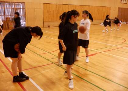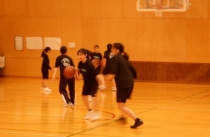新年度がスタートして、部活動にも新たな気持ちで頑張っています。画像は女子バスケットボール部です。部活動指導員の方に見守られ、生徒は主体的に練習しています。
