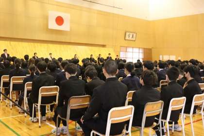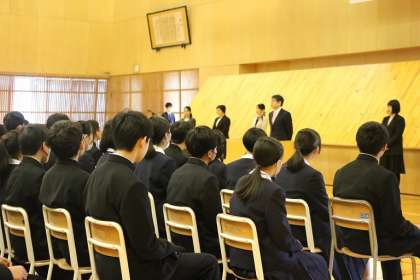 離任式を行いました。離任される先生や職員の方からの最後のお話です。さみしい思いを噛みしめながら、真剣に耳を傾けています。