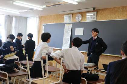 新しい学級での休み時間の様子です。新担任と和やかに話したり、新クラスのメンバーを確認したりしています。新しい環境にワクワクしている様子が伝わってきます。