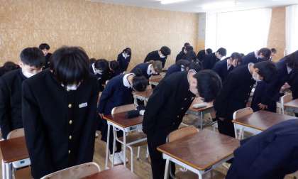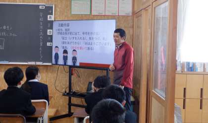 1−Aの学活の様子です。授業の始まりと終わりに行う「あいさつ」の練習をしています。あいさつは、コミュニケーションの第一歩。お互いに気持ちよく生活するために、大切にしていきましょう!