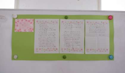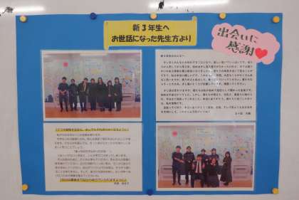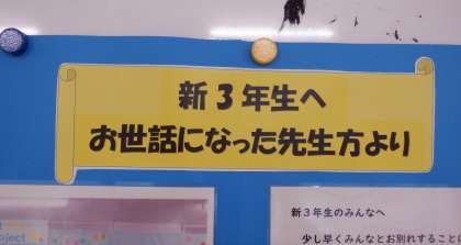 2、3学年のフロアには、転任された先生方からのメッセージがけいじしてあります。先生方の励ましに、力をもらっています。
