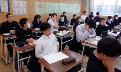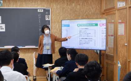 2−Aの家庭科の授業風景です。今日は、2年生になって初めての授業なのでオリエンテーションをしています。どんなことを学ぶのかな?