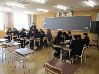 各クラスの会長、書記、班長が集まり、第1回の拡大学年生徒会を行いました。今日の議題は、「学年目標を決めよう!」です。