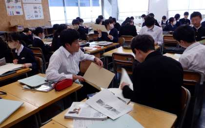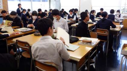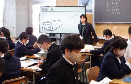 3−Bの美術の授業風景です。昨年度学習した「二点透視図法」の復習をしています。覚えているかな?