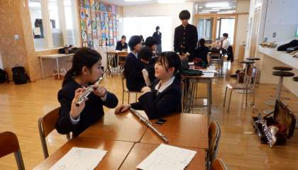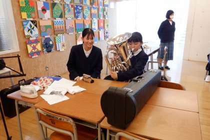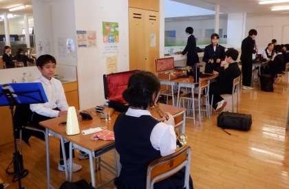 4月12日(金) 放課後 吹奏楽部です。パートに分かれて、先輩が優しく指導しています。