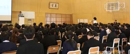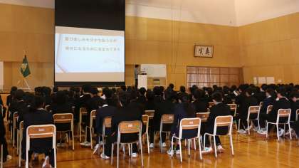 16日(火)に、創校記念式を行いました。「先輩に学ぶ講演会」として、本校卒業生の林さんに「今を真剣に生きよう」という題で、講演していただきました。林さんは、「人は幸せになるために、生まれてきた。そのために、今できることを精一杯やろう」「これからは、人生100年の時代。自分で行動を選択し、実行に移せる、自律した人を目指そう」など、心に残るお話をしてくださいました。