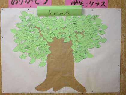 「これまでに言われてうれしかった言葉」を書いた葉を、書記会のメンバーが「幸せの木」に貼ってくれ、「幸せの木」に葉が生い茂りました。