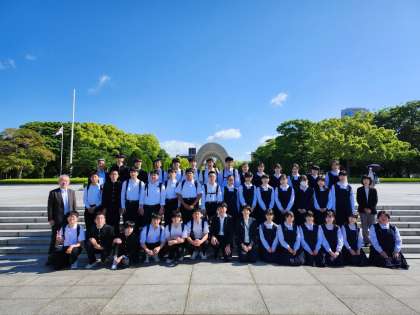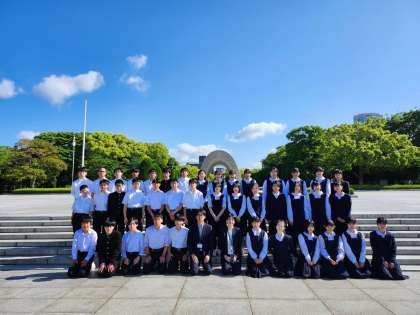 5月9日(木) 平和セレモニーのあと、A組とB組は原爆資料館の見学ます。その前に全員で記念撮影です。