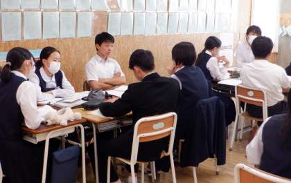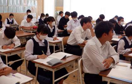 3−Bの国語の授業風景です。「挨拶」の学習をしています。先日訪れた広島が題材となっています。生徒は、思い出しながら考えています。