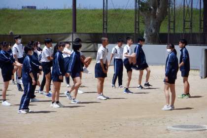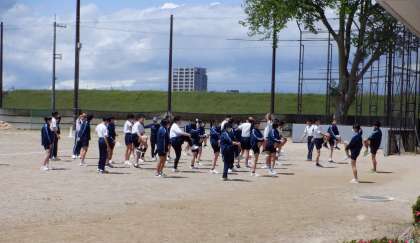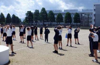 体育の授業の始まりでは、必ず準備運動をします。どのクラスも、生徒が主体的に声をかけ合って行っています。ステキです!