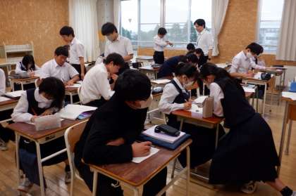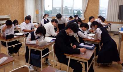 3−Bの数学の授業風景です。今年度は、3年生の数学を少人数で実施しています。「この問題、分からないんだよね〜」と、互いに学び合う姿が多く見られます。頑張っています、3年生!