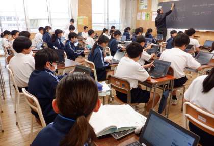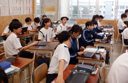 端末を活用して 1−B英語 公開日 2024/05/21 更新日 2024/05/21 芝園の一日 5月21日(火) 1限 1−Bの英語の授業風景です。今日はALTの先生と一緒に活動、端末を活用して楽しく学習しています。