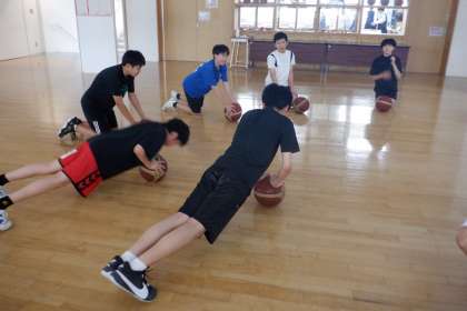 男子バスケットボール部です。「ボール腕立て伏せ」にチャレンジしています。なかなか難しそう!